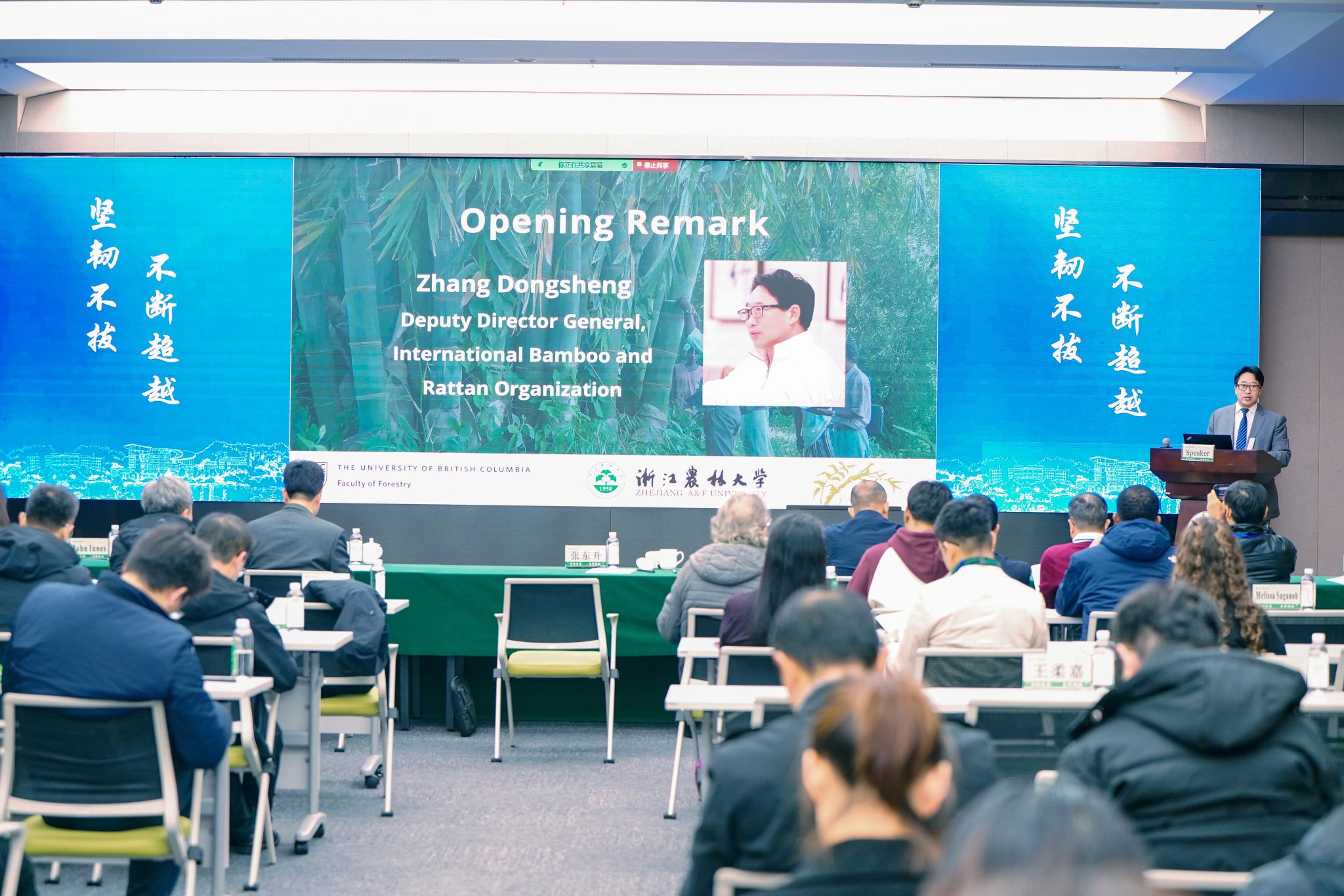 国际竹藤组织副总干事张东升、国际竹藤中心主任覃道春、浙江农林大学校长吴家胜、加拿大不列颠哥伦比亚大学林学院院长Rob Kozak教授出席开幕式并致辞。来自国内外43家高校、科研机构和产业协会的二百多名专家、青年教师和研究生线下参加了开幕式。开幕式由瑞典皇家科学院院士John Innes教授主持。