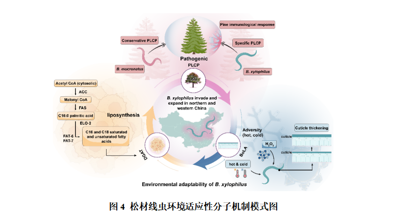 更具突破性的是,团队发现三大基因并非独立作用,而是形成“逆境适应—能量储备—宿主浸染”的协同调控体系,让松材线虫既能在极端环境存活,又能高效侵染寄主,最终实现跨区域扩散蔓延。这一成果精准回答了松材线虫向高纬度、高海拔扩散的行业核心问题,为应对气候变暖驱动的病害扩散,以及开发精准防控技术提供了重要靶点。